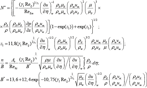 Следует заметить, что в этом случае профили скорости и энтальпии сильнее всего изменяются вблизи стенки и незначительно в районе внешней границы пограничного слоя. Поэтому шаг интегрирования по координате η в поперечном направлении необходимо сделать переменным: малым вблизи стенки, поскольку в турбулентном слое коэффициент трения должен быть соответствующим ламинарному подслою и составлять ~ 0.0005 ÷ 0.001 от толщины слоя, и большим вблизи ηk.