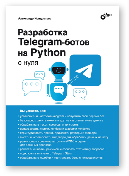 Создавайте умные и полезные Telegram-боты на языке Python с помощью фреймворка aiogram! Эта книга проведет вас через все этапы разработки — от запуска первого бота до построения сложных диалоговых систем, интеграции платежей и тестирования.