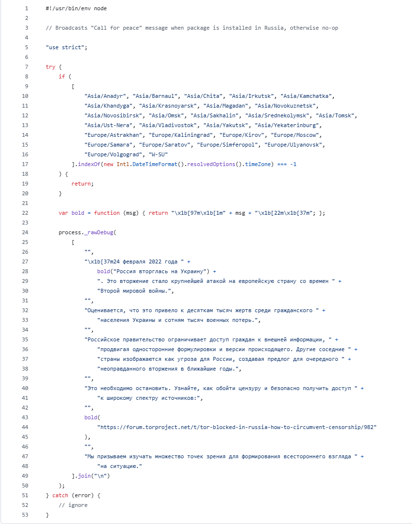 Разработчик пакета es5-ext добавил в код вывод всплывающего сообщения в консоль при определенных условиях. Специалисты «Доктор Веб» классифицируют данное поведение как злонамеренную вставку вредоносного кода, не имеющего никакого отношения к функционалу библиотеки, направленную против части пользователей на основе региональной принадлежности, что является достаточным основанием для детектирования.