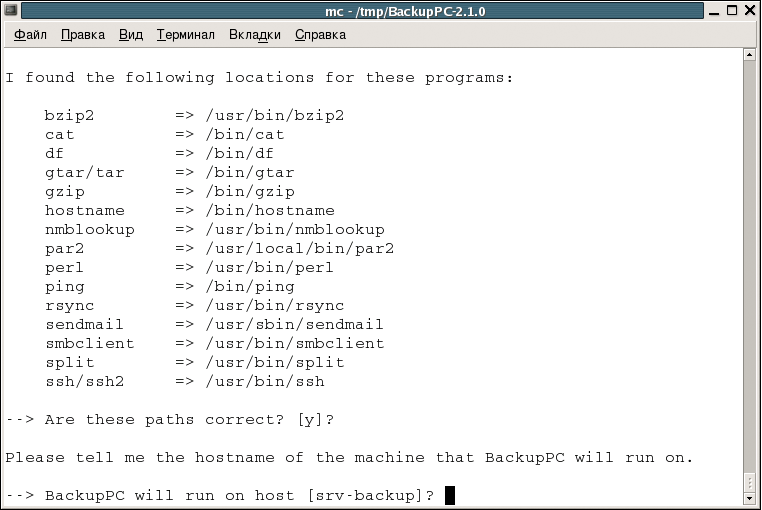 В ходе установки вам потребуется ответить на ряд вопросов. На первый – просьбу указать полный путь к уже установленной старой версии – можно ответить, просто нажав «Enter», поскольку выполняется первоначальная установка. После вам будут показаны пути к утилитам, требуемым BackupPC, которые скрипт определил самостоятельно, с просьбой подтвердить их расположение. Затем необходимо проверить, правильно ли скрипт определил имя хоста и имя пользователя, которого мы создали ранее, а также директорию для установки исполнимых файлов и директорию для хранения данных.