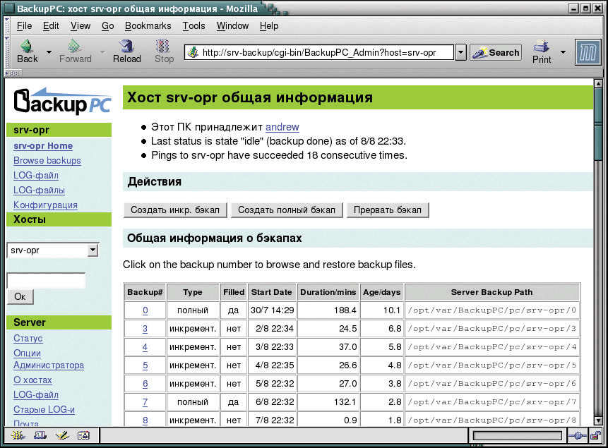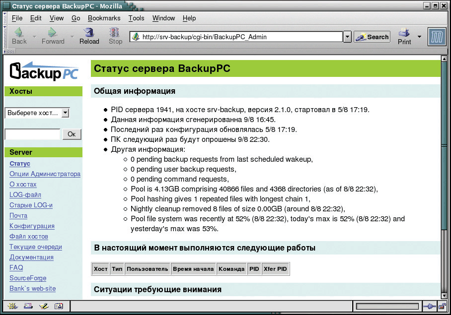 Интерфейс системы достаточно прост и нагляден. Обратившись по адресу: http://имя_сервера/cgi-bin/BackupPC_ Admin, вы попадаете в окно с общей информацией по серверу BackupPC. В левой части окна присутствует меню с ссылками на более подробную информацию по работе всего сервера, а также выпадающее меню с возможностью выбора информации по конкретному архивируемому хосту.