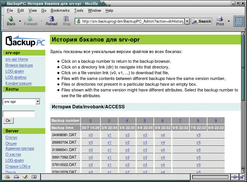 Зайдя в меню по конкретному хосту, можно получить всю информацию касательно выполненных операций резервирования данных, просмотреть списки архивных копий, а также «провалиться» в любой из них и восстановить файлы и каталоги полностью или частично. Также имеется возможность скопировать любой из файлов средствами браузера на ту машину, с которой вы зашли на сервер.